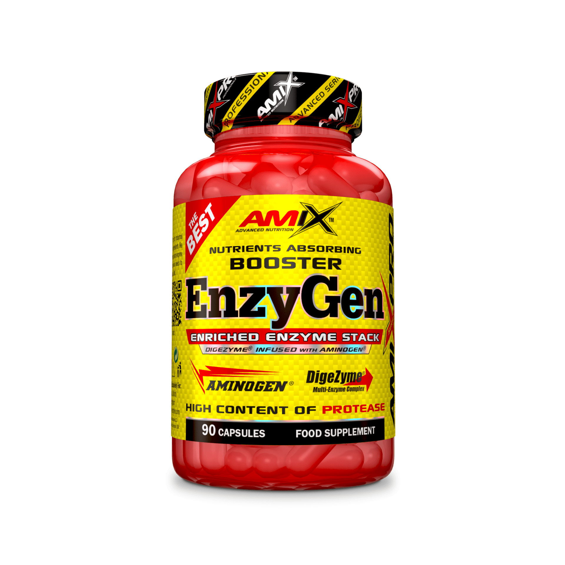 Amix® EnzyGEN es un complemento alimenticio en cápsulas compuesto por el complejo enzimático DigeZyme® y por el ingrediente natural derivado de plantas patentado Aminogen®.