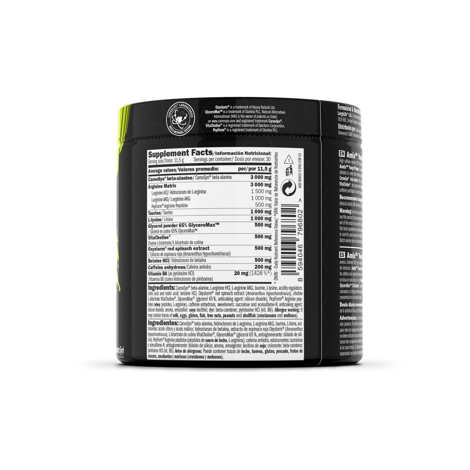 Ingredientes: CarnoSyn® beta-alanina, hidrocloruro de L-arginina, L-arginina AKG, taurina, L-lisina, acidulantes:ácido cítrico y ácido málico; hidrocloruro de betaína, extracto de espinaca roja Oxystorm® (Amaranthus hypochondriacus), L-bitartrato de colina VitaCholine®,GlyceroMax® (glicerol 65 %, antiaglomerante: dióxido de silicio), PepForm® Arginina péptidos(péptidos desuero de leche, L-arginina), cafeína anhidra, edulcorantes: sucralosa y acesulfamo-K; antiaglomerante: dióxido de silicio; aroma, emulgente: lecitina desoja; colorante: beta-caroteno; piridoxina HCl (vit. B6).Aviso de alérgenos:Puede contener trazas de leche, huevos, gluten, pescado, frutos de cáscara, cacahuetes y mariscos (crustáceos y moluscos).